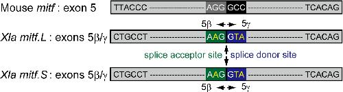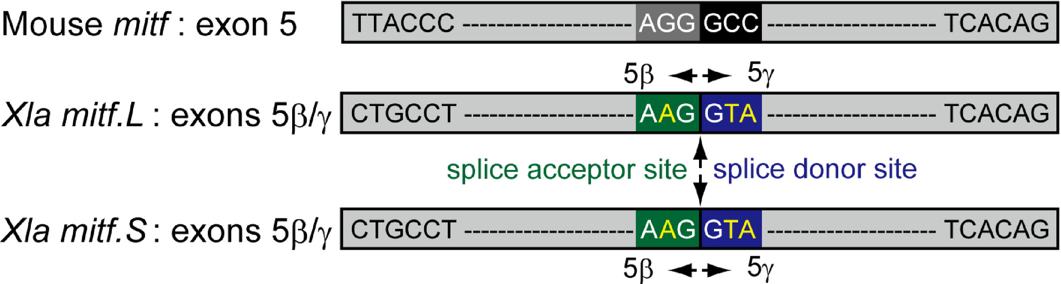 Figure 3. Comparison of “exon 5” in mouse mitf and exons 5β/γ in X. laevis mitf.L and mitf.S. The amino acid sequences of exons 5β/γ in X. laevis mitf.L and mitf.S are identical to those of “exon 5” in mouse mitf (see Figure ). AGG (dark gray) and GCC (black) in mouse mitf “exon 5” correspond to AAG (green) in exon 5β and GTA (blue) in exon 5γ, respectively, in X. laevis mitf.L and mitf.S. If AGG (dark gray) and GCC (black) change into AAG (green) and GTA (blue), splice acceptor (green) and donor (blue) sites would be created, respectively. Arrows indicate the boundary of exon 5β and exon 5γ in X. laevis mitf.L and mitf.S.
