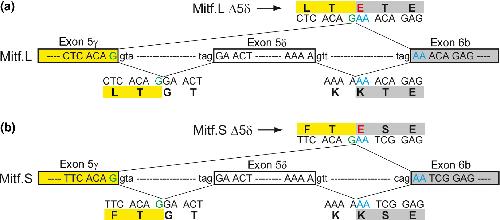 Figure 4. Alteration of a single amino acid associated with exon skipping in transcript variants of Mitf.L (a) and Mitf.S (b). When exon 6b is linked to exon 5δ, the amino acid in the beginning of exon 6b is a Lys (K) in both Mitf.L and Mitf.S. However, in the transcripts skipping exon 5δ (Mitf.L Δ5δ and Mitf.S Δ5δ), the amino acid in the beginning of exon 6b is a Glu (E). These Mitf transcript variants skipping exon 5δ are present both in the wild type and the mutant (see Figure ).