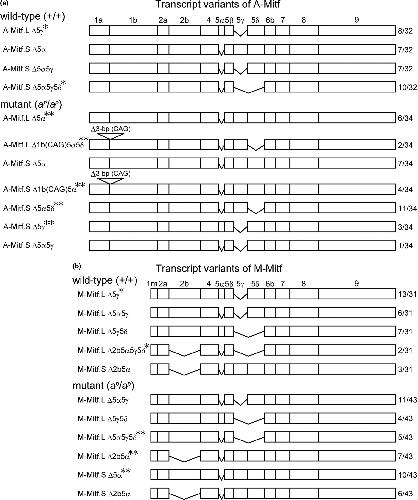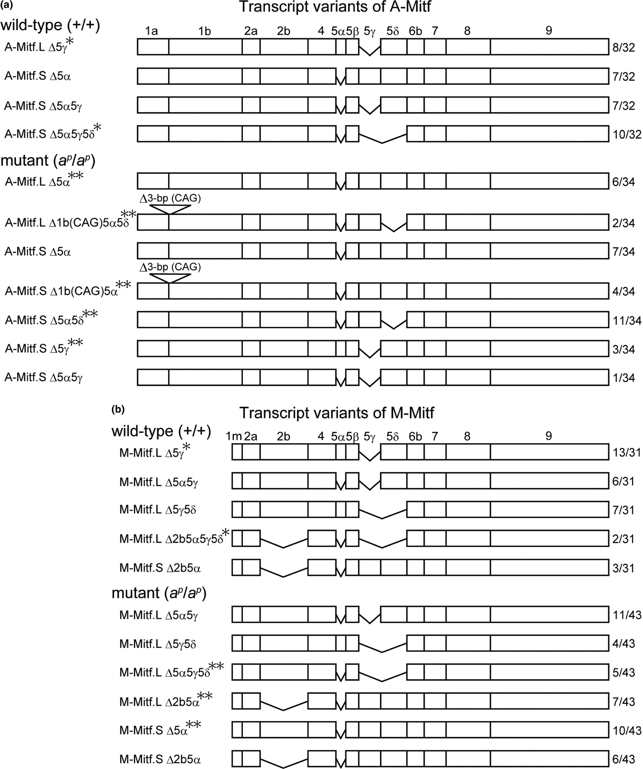 Figure 5. Transcript variants of A‐Mitf (a) and M‐Mitf (b) in the wild type and the mutant. Exons are shown as boxes and numbered as in Figure . New transcript variants, A‐Mitf.L Δ1b(CAG) and A‐Mitf.S Δ1b(CAG), were present in A‐Mitf.L and A‐Mitf.S of the mutant. These variants were produced by alternative splicing at acceptor site (CAG), deleting the first 3‐bp (CAG) of exon 1b (see Figure for details). The numbers on the right represent the number of clones with the transcript variant per the total number of clones sequenced. The data were collected and presented separately for the wild type and the mutant. Single asterisks indicate Mitf transcript variants observed only in the wild type. Double asterisks indicate Mitf transcript variants detected only in the mutant. Accession numbers: A‐Mitf transcript variants, LC315567‐LC315575 (DDBJ); M‐Mitf transcript variants, LC315576‐LC315583 (DDBJ).