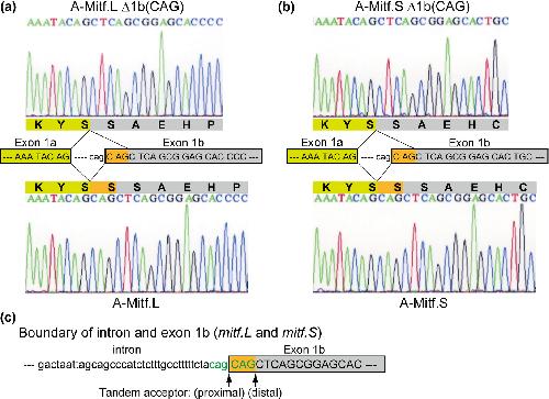 Figure 6. Newly identified transcript variants, A‐Mitf.L Δ1b(CAG) and A‐Mitf.S Δ1b(CAG), produced by alternative splicing at the acceptor site (CAG) in exon 1b in the mutant. The DNA chromatogram, amino acid sequences, and splice site of exon 1b in A‐Mitf.L (a) and A‐Mitf.S (b) are shown. Subgenome genes, mitf.L and mitf.S, have the identical sequence around the boundary of intron and exon 1b, where tandem splice sites (CAGCAG acceptors) are present (c). There is no difference in the sequence around the acceptor site of exon 1b of the wild type and the mutant. Alternative splicing at the tandem acceptor (CAG) in exon 1b leads to the deletion of one amino acid, Ser (S), in both A‐Mitf.L and A‐Mitf.S.