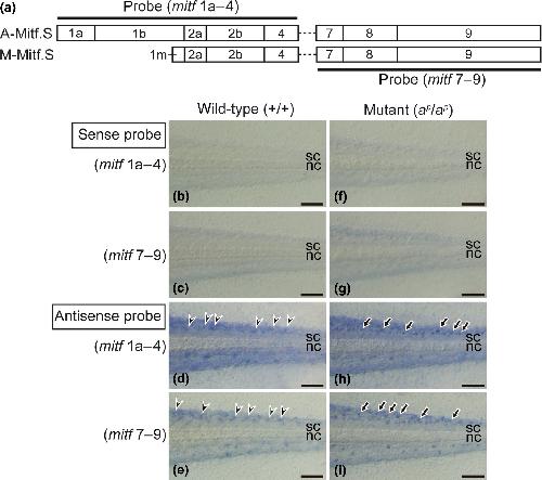 Figure 7. Expression of mitf mRNA in white pigment cells and melanophores. RNA probes were generated from the sequence encoding either exons 1aâ4 or exons 7â9 of Mitf.S (a). Photographs of the wildâtype tail (bâe) and the mutant tail (fâi) at stage 46 are shown. Tadpoles were bleached to remove melanin before hybridization. In the negative control using a sense probe of either mitf 1aâ4 or mitf 7â9, no staining was observed in the tails of either the wild type (b, c) or the mutant (f, g). WISH using an antisense probe of mitf 1aâ4 (d, h) indicated that staining was observed in melanophores in the wildâtype tail (d, arrowheads) and white pigment cells in the mutant tail (h, arrows). Using an antisense probe of mitf 7â9, staining was also detected in melanophores in the wildâtype tail (e, arrowheads) and white pigment cells in the mutant tail (i, arrows). nc, notochord. sc, spinal cord. Scale bars: 100 μm.