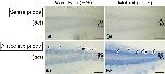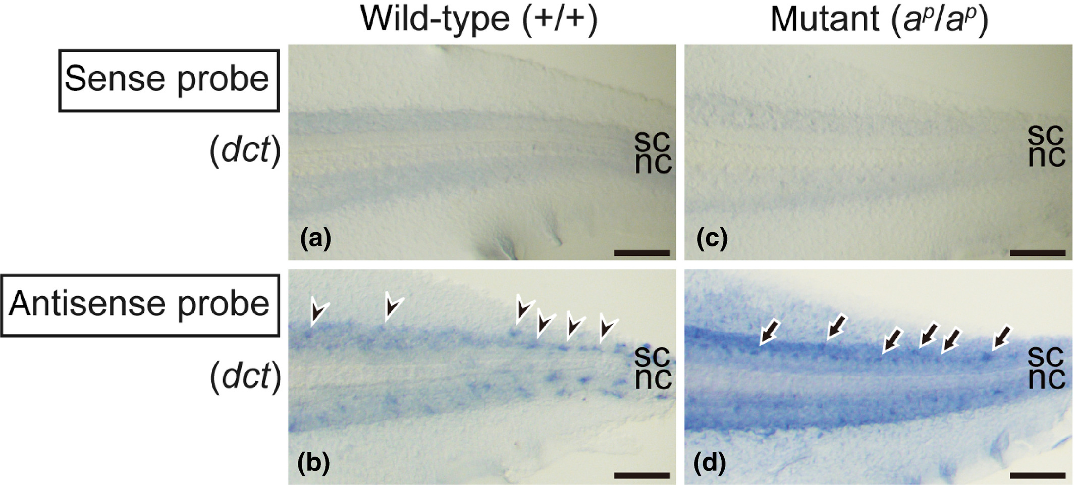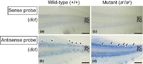 Figure 8. Expression of dct mRNA in white pigment cells and melanophores. Photographs of the wildâtype tail (a, b) and the mutant tail (c, d) at stage 46 are shown. Tadpoles were bleached to remove melanin before hybridization. In the negative control using a sense probe of dct, no staining was observed in the tails of either the wild type (a) or the mutant (c). Using an antisense probe of dct, staining was detected in melanophores in the wildâtype tail (b, arrowheads) and in white pigment cells in the mutant tail (d, arrows). nc, notochord. sc, spinal cord. Scale bars: 100 μm.