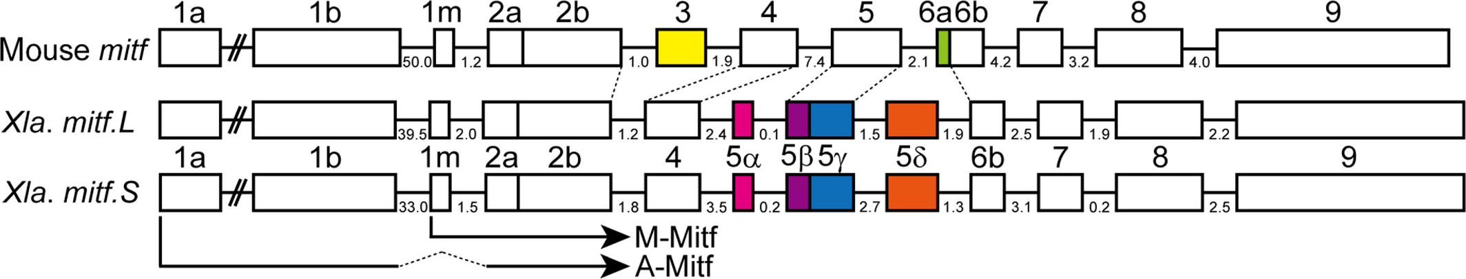 Figure 1. Comparison of mitf exons between X. laevis and mouse. Exons used to produce A‐Mitf and M‐Mitf are indicated as boxes and numbered according to Hallsson et al. (). The exons present between exon 4 and exon 6b in X. laevis mitf were named 5α, 5β, 5γ, and 5δ. The continuous exons 5β and 5γ were thought to be identical to mouse mitf “exon 5” (see Figure for details). Both mitf.L and mitf.S differ from mouse mitf by the absence of exons 3 and 6a, and the presence of exons 5α and 5δ. Intron lengths (kb) in mouse mitf (Bharti, Liu, Csermely, Bertuzzi, & Arnheiter, ), mitf.L (NC_030730.1), and mitf.S (NC_030731.1) are shown.