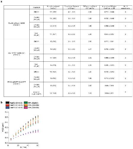 Extended Data Fig. 2. CK-689 does not significantly impact foci movementa, Summary of DSB movement analyses as related to Figures 3, 6, and Extended Data Figure 5. b, MSD of Rad52-mCherry foci and RPA-pEGFP-NLS foci treated with DMSO, CK-689 and CK-666. (Data shown as mean and weighted s.e.m.; Rad52: CK-689 n=3262 foci from 13 nuclei, CK-666 n=2143 foci from 12 nuclei, DMSO n=3292 foci from 12 nuclei. RPA32: CK-689 n=790 foci from 13 nuclei, CK-666 n=823 foci from 12 nuclei, DMSO n=1031 foci from 10 nuclei). MSD of Rad52 DMSO also shown in Fig. 6i. MSD of Rad52 CK-689 and CK-666 also shown in Fig. 3g. MSD of RPA CK-689 and CK-666 also shown in Fig. 3l. |