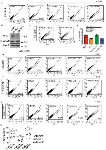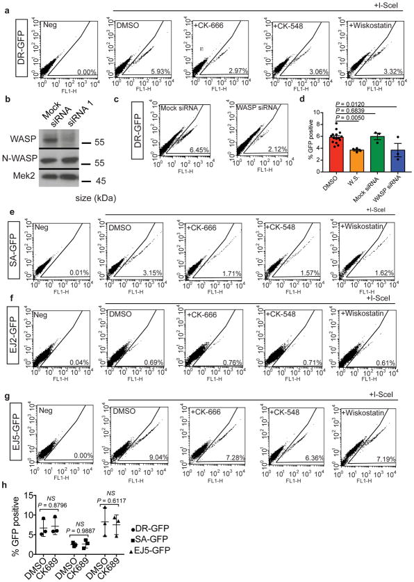 Extended Data Fig. 7. WASP and Arp2/3 mediate DSB repair by homology-directed mechanismsa, Representative FACS plots of GFP+ cells in the HDR (DR-GFP) assay. b, Western blot shows expression of WASP and N-WASP following siRNA knockdown in whole cell lysates (single experiment). WASP siRNA 1: 5′-GAGUGGCUGAGUUACUUGC-3′. c, Representative FACS plots of GFP+ cells in the HDR (DR-GFP) assay in WASP and mock-depleted cells. d, Summary of DR-GFP assay with WASP depletion (P calculated by one-way ANOVA with multiple comparisons; data shown as mean and s.e.m; n=3 independent experiments). HDR efficiency in the presence of DMSO or Wiskostatin (Fig. 5a) shown for comparison. e, Representative FACS plots of GFP+ cells in the SSA (SA-GFP) assay. f, Representative FACS plots of GFP+ cells in the MMEJ (EJ2-GFP) assay. g, Representative FACS plots of GFP+ cells in the NHEJ (EJ5-GFP) assay. h, Summary of DR-GFP, SA-GFP, and EJ5-GFP assays with CK-689 (P calculated by two-way ANOVA with multiple comparisons; data shown as mean and s.d.; n=3 independent experiments). n.s = not significant. |
