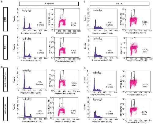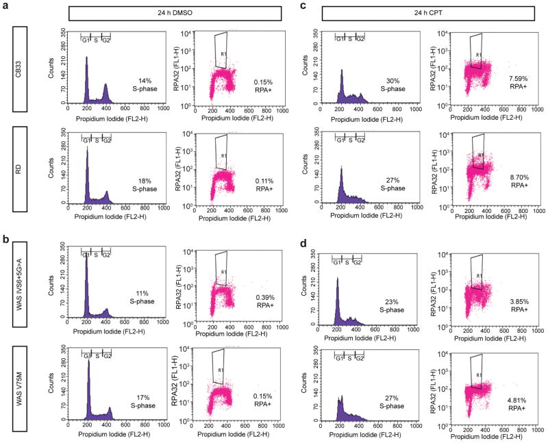 Extended Data Fig. 9. B-lymphocytes derived from Wiskott-Aldrich Syndrome patients exhibit reduced DSB end-resectiona, Representative cell cycle distribution of CB33 and RD lymphocytes derived from healthy controls following DMSO treatment is shown (left). The percentage RPA positive S-phase cells following DMSO treatment was measured by flow cytometry (right). (n=4 independent experiments). b, Representative cell cycle distribution of lymphocytes bearing the V75M mutation in the WAS gene or a G>A transition at position 5 in intron 6 of the WAS gene (IVS6+5G>A) is shown following DMSO treatment (left). The percentage RPA positive S-phase cells following DMSO treatment was measured by flow cytometry (right). (n=4 independent experiments). c, Representative cell cycle distribution of CB33 and RD lymphocytes derived from healthy controls following CPT treatment (left). The percentage RPA positive S-phase cells following CPT treatment was measured by flow cytometry (right). (n=4 independent experiments). d, The cell cycle distribution of V75M or IVS6+5G>A lymphocytes following CPT treatment is shown (left). The percentage RPA positive S-phase cells following CPT treatment was measured by flow cytometry (right). (n=4 independent experiments). |