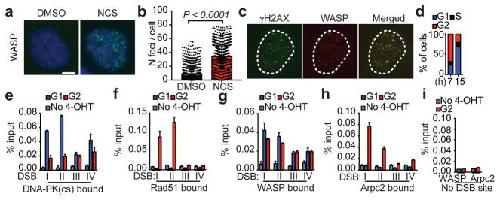 Figure 2. Arp2/3 and WASP co-localize at HDR breaksa, Representative U2OS cells with WASP foci. b, Quantification of WASP foci (P calculated by two-sided Mann-Whitney test; data shown as mean and s.d.; n=1231 (DMSO), 1327 nuclei (NCS). c, γH2AX co-localization with WASP (n=30 nuclei; r=0.60±0.07, Pearson). d, Cell cycle distribution of synchronized ER-AsiSI-U2OS cells post thymidine release. DNA-PKcs (e,) Rad51 (f,) WASP (g,) and Arpc2 (h,) enrichment (ChIP) at DSBs I–IV in G1 and G2. Mean and s.d. (n=3 technical replicates) of a representative experiment (out of two independent experiments). i, Mean and s.d. of Arpc2 and WASP enrichment at an undamaged site in G2 cells (n=3 technical replicates) of a representative experiment (out of two independent experiments). Scale bar is 10 μm. |