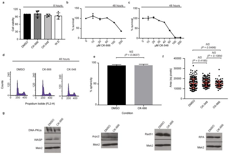 Extended Data Fig. 4. WASP and Arp2/3 inactivation do not impair U2OS cell viability, nuclear area, nuclear sphericity or protein expressiona, Cell survival after 8 hours of 100 μM CK-666, 50 μM CK-548, or 3 μM Wiskostatin treatment. Data shown as mean and s.e.m. n=4 independent experiments. b, Cell survival after 48 hours of increasing concentrations of CK-666. n=3 independent experiments. Data shown as mean and s.e.m. c, Cell survival after 48 hours of increasing concentrations of CK-548. n=3 independent experiments. Data shown as mean and s.e.m. d, Representative cell-cycle distribution of cells treated with DMSO, 50 μM CK-666, or 25 μM CK-548 for 48 hours (out of three independent experiments). e, Analysis of nuclear sphericity (P calculated by Student’s two-tailed t-test; data shown as mean and s.d.; DMSO n=117 nuclei, CK-666 n=117 nuclei). ns, not significant. f, Analysis of nuclear area (P calculated by one-way ANOVA with multiple comparisons; data shown as mean and s.d.; DMSO n=210 nuclei, CK-548 n=189 nuclei, CK-666 n=92 nuclei). g, Expression of Rad51, DNA-PK(cs), WASP, and Arpc2 validating antibodies employed in Fig. 2e–i (single experiment). Mek2 is a loading control. RPA expression levels also shown. |