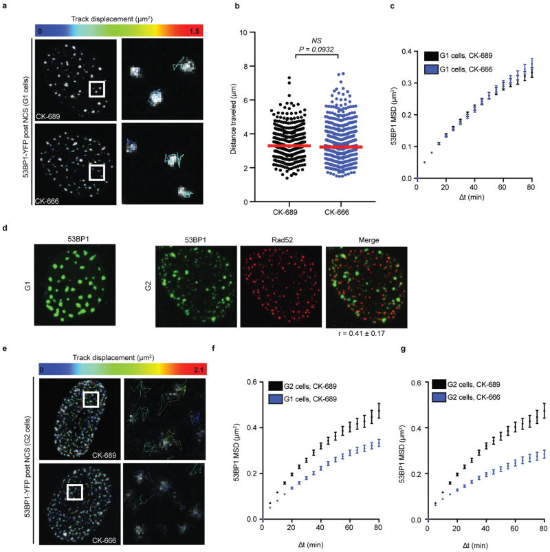 Extended Data Fig. 5. Arp2/3 enhances movement of 53BP1 foci in G2a, Representative U2OS nuclei showing 53BP1-YFP foci traces over 100 min in G1 cells b, Median cumulative distance traveled by 53BP1-YFP foci in G1 cells (P calculated by two-tailed Mann-Whitney test; CK-689 n=462 foci from 14 nuclei, CK-666 n=647 foci from 14 nuclei). ns, not significant. c, MSD of 53BP1-YFP foci in G1 cells (Data shown as mean and weighted s.e.m.; CK-689 n=926 foci from 14 nuclei, CK-666 n=1234 foci from 14 nuclei). Δt = time interval. d, A representative G1 cell is shown with 53BP1-YFP foci (left). A representative G2 cell is shown with 53BP1-YFP and Rad52-mCherry foci (right). 53BP1 foci colocalize with Rad52 foci (r = 0.41 ± 0.17, Pearson, n=5 independent experiments). e, Representative U2OS nuclei showing 53BP1-YFP foci traces over 100 min in G2 cells. f, MSD of 53BP1-YFP foci (Data shown as mean and weighted s.e.m.; G1 CK-689 n=926 foci from 14 nuclei, G2 CK-689 n=1403 from 12 nuclei). G1 CK-689 curve also shown in (c). g, MSD of 53BP1-YFP foci in G2 cells (Data shown as mean and weighted s.e.m.; CK-689 n=1403 foci from 12 nuclei, CK-666 n=1038 foci from 10 nuclei). G2 CK-689 curve also shown in (f). |