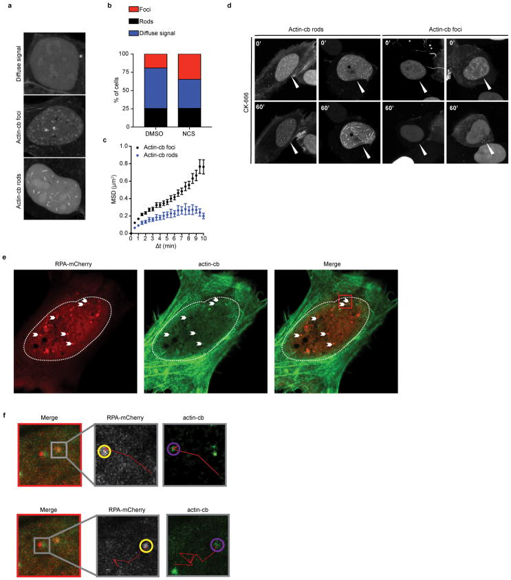 Extended Data Fig. 6. Arp2/3 promotes actin foci assembly following DNA damagea, Representative U2OS nuclei showing classes of nuclear actin structures following transient transfection of nuclear actin-chromobody-tag-GFP. b, Percentage of cells with diffuse signal, nuclear actin-cb foci, or rods with or without NCS (DMSO n=473 cells, NCS n=473 cells). c, MSD of actin-cb foci and actin-cb rods (Data shown as mean and weighted s.e.m.; actin-cb foci n=662 foci from 11 nuclei, actin-cb rods n=161 rods from 5 nuclei). d, Representative images of U2OS nuclei with actin rods or actin-cb foci following CK-666 treatment (n=5 independent experiments). e, Representative image of a U2OS nucleus with RPA-mCherry and actin-cb foci (of n=3 independent experiments). Arrowheads indicate sites of RPA-mCherry and actin-cb co-localization. f, Expanded image of RPA-mCherry and actin-cb co-localization from e, red box. Traces of RPA and actin-cb foci are shown in red. Yellow and purple circles encompass RPA and actin-cb foci, respectively. (n=3 independent experiments). |