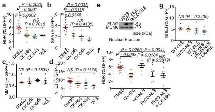 Figure 5. WASP and Arp2/3 mediate HDRa, Summary of DR-GFP (HDR) assay (n=10, 6, 4, 4 left to right). ns, not significant. b, Summary of SA-GFP (SSA) assay (n=7, 4, 4, 3 left to right). c, Summary of EJ2-GFP (MMEJ) assay (n=4, 3, 3, 3, left to right). d, Summary of EJ5-GFP (NHEJ) assay (n=14, 6, 6, 3, left to right). e, Western blot shows FLAG-WT-NLS or FLAG-R62D-NLS overexpression in U2OS nuclear soluble fraction (single experiment). f, DR-GFP assay in cells transfected with FLAG-WT-NLS or FLAG-R62D-NLS. (n=7, 7, 7, left to right). HDR efficiency in the presence of DMSO or CK-666 (Fig. 5a) shown for comparison. g, EJ5-GFP assay in cells transfected with FLAG-WT-NLS or FLAG-R62D-NLS. (n=6, 6, 6, left to right). For 5a–g, P calculated by one-way ANOVA with multiple comparisons as indicated; data shown as mean and s.e.m. n represents independent experiments. |