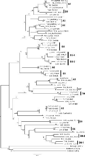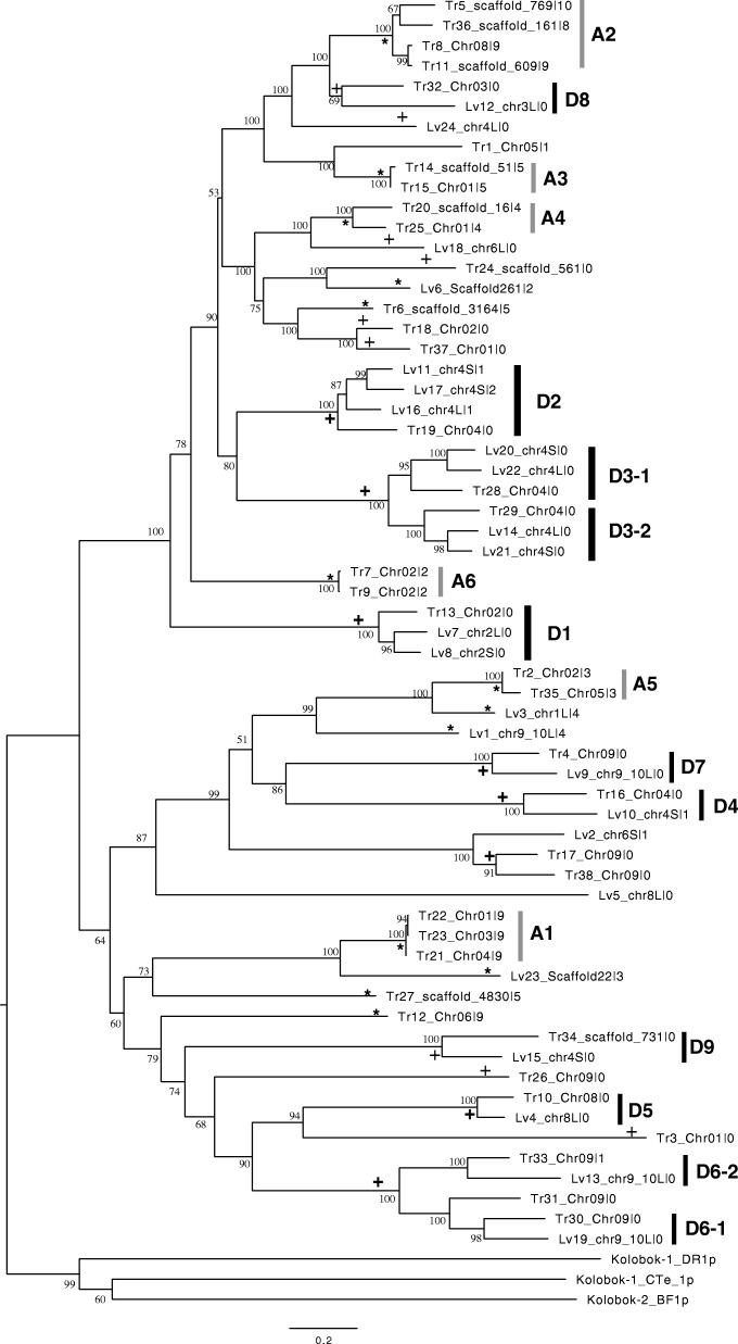Fig. 2. Molecular phylogeny of prospective XKol transposases. Molecular phylogenetic trees of XKol-Tpase amino acid sequences inferred using the neighbor-joining method. Each operational taxonomic unit is represented by the names of the CDS and a chromosome or scaffold on which the CDS is located. The number of blastn hits to truncated transposase sequences are shown as numerals following the vertical bar. The percentage of replicate trees in which the associated taxa clustered together in the bootstrap test (500 replicates) are shown next to the branches. The symbol “+” on the branches indicates domestication events. Asterisks indicate transpositional amplification events. Subfamilies of putative domesticated transposase orthologs are grouped by black bars and named D1–D9. CDS subfamilies that may have been duplicated by recent transposition and amplification are grouped by gray bars and designated A1–A6