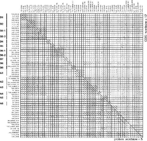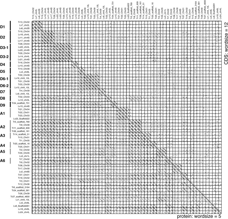 Fig. 3. Dot plot analysis of XKol-Tpase gene CDSs. All-to-all comparisons of XKol-Tpase CDSs (upper right) and proteins (lower left) performed by dot plot analyses. D1–D9 and A1–A6 are grouped in the same way as in Fig. 2