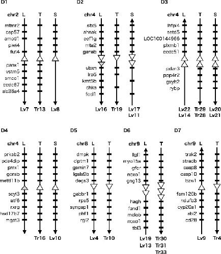 Fig. 4. Synteny of XKol-Tpase genes. Conserved synteny around putative domesticated orthologs of subfamily D1–D7. Xenopus laevis homeologous chromosomes L and S and Xenopus tropicalis homologous chromosome (T) are indicated by arrows. The orientation of each arrow indicates the 5′ to 3′ direction. XKol-Tpase CDSs are represented by white triangles on the chromosomes, and their names are shown below the chromosomes. Gray triangles indicate truncated XKol-Tpase sequences. Gene models around the CDSs are represented by black bars