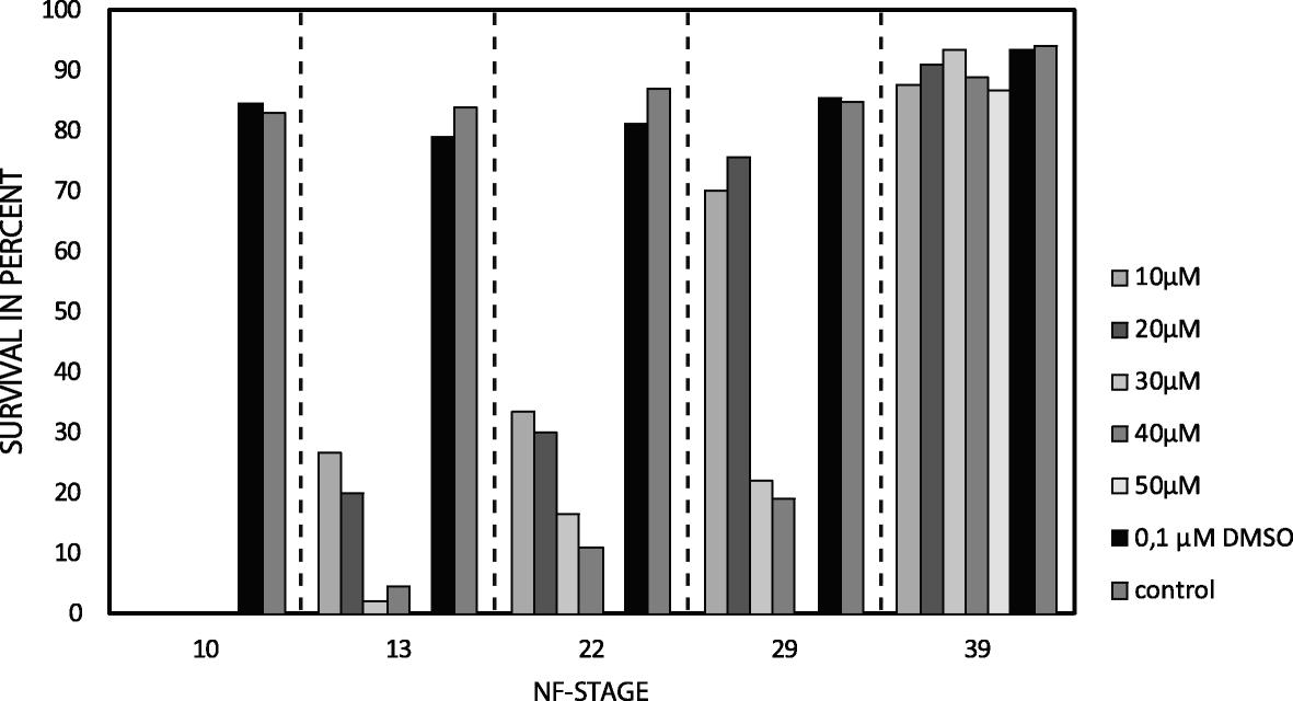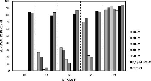 Quantitative analysis of X. laevis tadpole survival after Ly-294,002 treatment. X. laevis larvae were treated with different amounts of Ly-294,002 at different developmental stages until NF 45. As controls, X. laevis larvae were raised either in 0,1 μM DMSO or in 0,1à MBS. Larvae treated with DMSO and with 0,1à MBS show no significant differences in survival rates. The survival rate in Ly-294,002 treated larvae declines with increasing Ly-294,002 concentration and early start of the incubation |