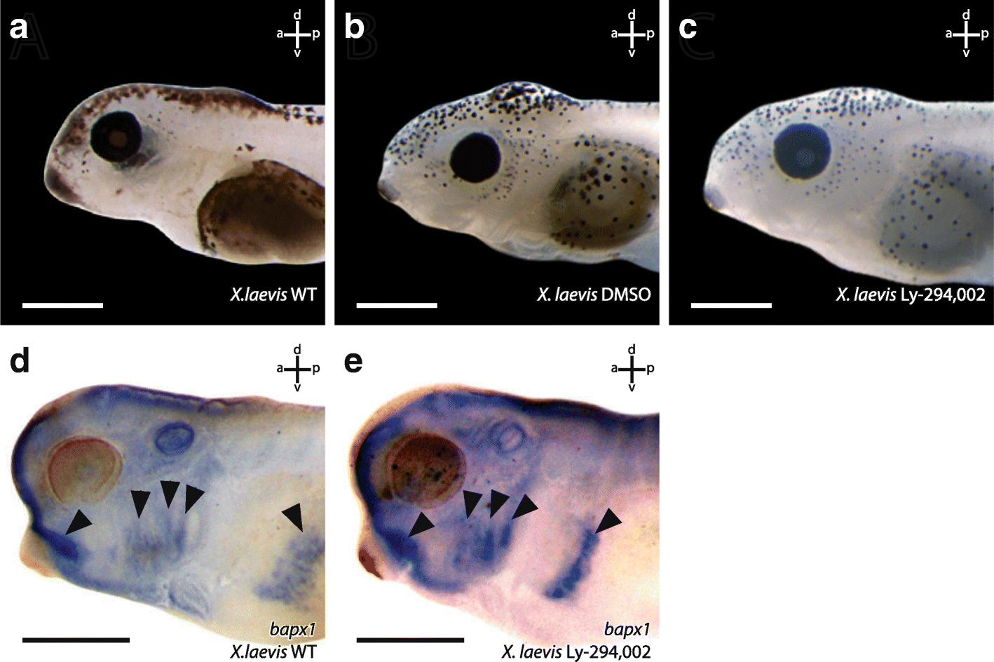 Effects of Ly-294,002 treatment on external head morphology and bapx1 expression in X. laevis. Lateral view of larvae at NF 44 after rearing in a 0,1à MBS as control, b 0,1 μM DMSO and c 20 μM Ly-294,002 from NF 29 onwards. No significant differences in the external morphology can be observed. In situ hybridisation of NF 37 X. laevis larvae raised in d 0,1xMBS as control and e 20 μM Ly-294,002 from NF 29 onwards in lateral view reveal differences in the expression of bapx1 in the mandibular arch. After bapx1 upregulation the mandibular arch expression domain is broader and extends postero-dorsally. Scale bar 500 μm |