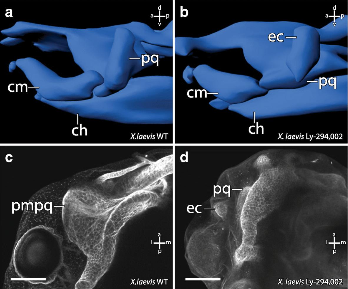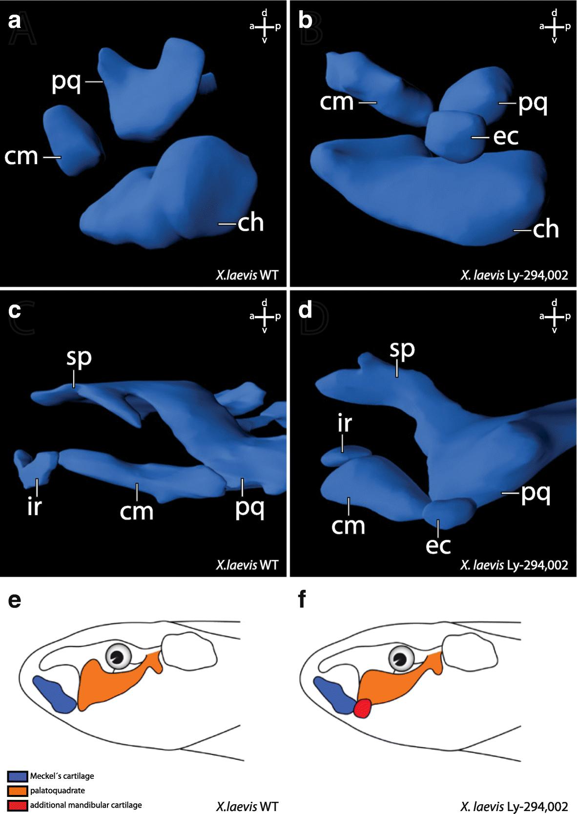 3D reconstructions based on confocal laser scanning microscopy showing the effects of Ly-294,002 treatment on cranial cartilage morphology in Xenopus laevis larvae. Lateral view of ZO 10 (a, b) and ZO 17 (c, d) larvae with normal bapx1 expression (left column) and elevated bapx1 expression (right column). In Ly-294,002-treated specimen with increased bapx1 expression an ectopic cartilage develops within the mandibular arch lateral to the palatoquadrate. Depictions of X. laevis larvae in lateral view show the main differences between e normal and f perturbed development. In short, the processus muscularis is reduced in size and an ectopic cartilage arises lateral to the palatoquadrate after upregulation of bapx1. ch, ceratohyal; cm, Meckel’s cartilage; ec, ectopic cartilage; ir, infrarostral cartilage; pq, palatoquadrate; sp., suprarostral plate |
