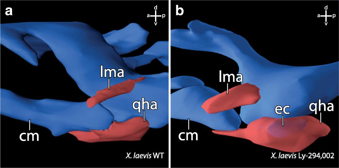 Effect of Ly-294,002 treatment on the external and internal morphology of A. mexicanum. Dorsal view of a control and b Ly-294,002 treated specimens reveals no differences in external morphology. Lateral view of 3D-reconstructions based on confocal laser scanning microscopy of c control and d Ly-294,002 treated specimen shows the development of an ectopic cartilage lateral to the jaw articulation in treated specimens. The musculature of e control and f treated specimens are similar and no changes in origination or insertion of muscles can be observed after bapx1 upregulation. cm, Meckel’s cartilage; dm, M. depressor mandibulae; ec, ectopic cartilage; lma, M. levator mandibulae articularis; lme, M. levator mandibulae externus; lml, M. levator mandibulae longus; pq, palatoquadrate. Scale bar 500 μm |