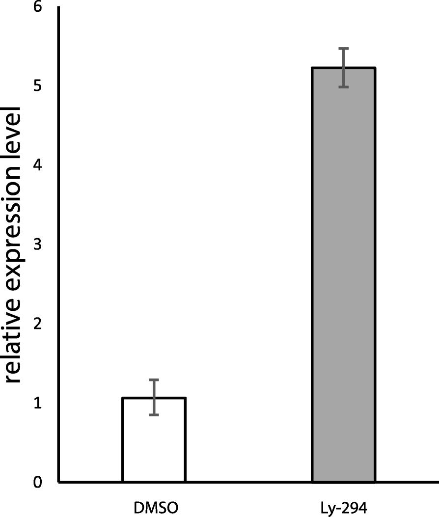 Effect of Ly-294,002 treatment on bapx1 expression in Xenopus laevis at NF 45. Expression levels were determined through relative quantification (Livak method). Error bars indicate standard deviation of PCR runs (n = 3). DMSO reared specimens show no significant reduction in expression compared to control specimens. Ly-294,002 treated specimens show a ~ 5 times higher expression level of bapx1 in comparison to controls |