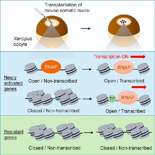 Oocytes have a remarkable ability to reactivate silenced genes in somatic cells. However, it is not clear how the chromatin architecture of somatic cells affects this transcriptional reprogramming. Here, we investigated the relationship between the chromatin opening and transcriptional activation. We reveal changes in chromatin accessibility and their relevance to transcriptional reprogramming after transplantation of somatic nuclei into Xenopus oocytes. Genes that are silenced, but have pre-existing open transcription start sites in donor cells, are prone to be activated after nuclear transfer, suggesting that the chromatin signature of somatic nuclei influences transcriptional reprogramming. There are also activated genes associated with new open chromatin sites, and transcription factors in oocytes play an important role in transcriptional reprogramming from such genes. Finally, we show that genes resistant to reprogramming are associated with closed chromatin configurations. We conclude that chromatin accessibility is a central factor for successful transcriptional reprogramming in oocytes.
