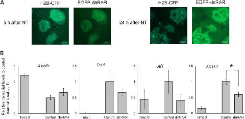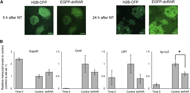 Figure 3. RAR Influences Transcriptional Reprogramming in Oocytes(A) NT oocytes overexpressed with EGFP-dnRAR and histone H2B-CFP were subjected to confocal microscopy. EGFP-dnRAR was accumulated in the injected nuclei. Scale bars indicate 5 μm.(B) Expression of RA-regulated genes was downregulated after overexpression of EGFP-dnRAR in NT oocytes. n = 3 (time 0) or 4 (control and dnRAR). Time 0 represents NT oocytes just after NT. Error bars represent ± SEM. âp < 0.05 by the Studentâs t test.