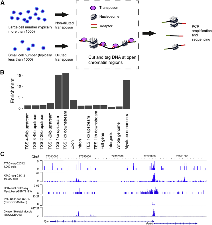 Figure 1. ATAC-Seq Enables the Identification of Open Chromatin Regions(A) The modified ATAC-seq protocol for our experiments.(B) The genomic distribution of ATAC-seq peaks in C2C12 mouse myoblasts, representing open chromatin. The y axis represents the enrichment of peaks in each type of genomic region relative to the whole genome. Two independently prepared ATAC-seq libraries were used for the analysis.(C) A track image of ATAC-seq from 1,000 and 50,000 cells, chromatin immunoprecipitation sequencing (ChIP-seq) of H3K4me3 (GSM72193) and RNA polymerase II (GSM915176), and DNase-seq (GSM1014189) at the Ppat and Paics genes in mouse muscle cells. Open chromatin at the TSS is adjacent to H3K4me3 marks.