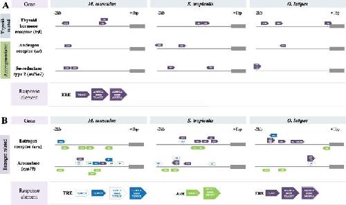 Fig. 1. Promoter analysis of M. musculus, S. tropicalis, and O. latipes TH-related genes (trβ) and androgen-related genes (ar, srd5α2) (A), and estrogen related genes (erα, and cyp19) (B). For information on tr and ar half-site motifs in thyroid- and androgen-re;ated genes please refer to Flood et al. (2013). All sequences used for analysis were collected from the Ensembl Project (http://www.ensembl.org). Putative transcription factor binding sites within the putative promoter (â2000 toâ¯+â¯1) were identified using PROMO (v.3.0.2; Farré et al., 2003) and FIMO (v.4.11.1; Grant et al., 2011) software. TREs are shown in blue, AREs are shown in green, and EREs are represented by purple arrows. This figure was adapted from Fig. 1 in Flood et al. (2013). (For interpretation of the references to colour in this figure legend, the reader is referred to the web version of this article.) |