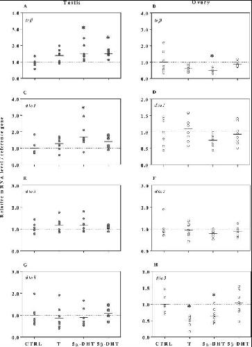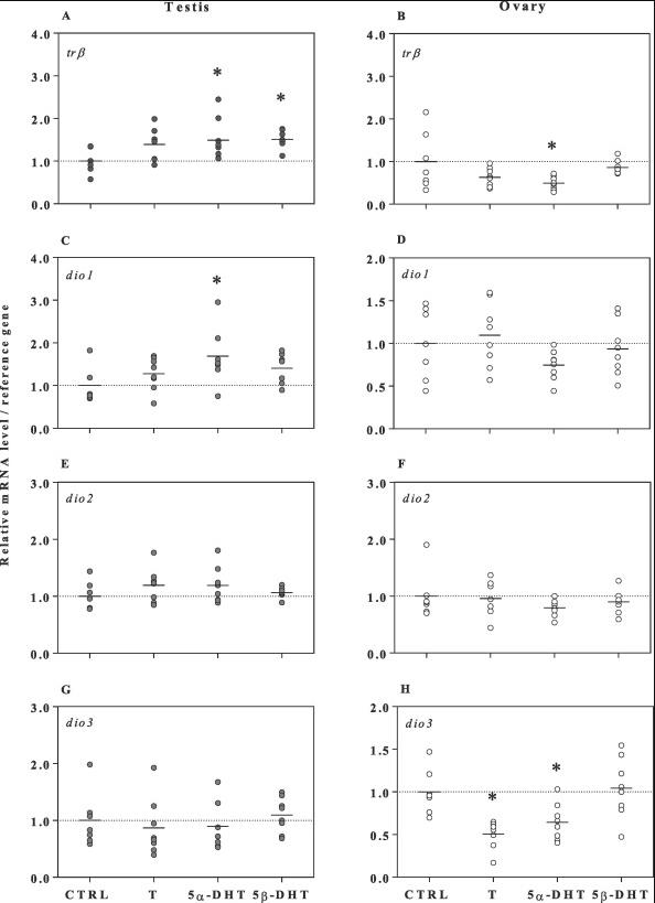 Fig. 2. Expression of trs (trβ) and dios (dio1, dio2, and dio3) in testes (A, C, E, and G, respectively) and ovaries (B, D, F, and H, respectively) exposed ex vivo to testosterone (T; 1â¯Î¼M), 5α-dihydrotestosterone (5α-DHT; 1â¯Î¼M), and to 5β-dihydrotestosterone (5β-DHT; 1â¯Î¼M) for 6â¯h. Symbols represent individual samples (nâ¯=â¯6â8 per treatment). Gene expression data are normalized to odc and presented as fold changes relative to the control treatment. Significant differences between treatments and the control (*) were identified by one-way ANOVAs followed by post hoc Dunnettâs tests (pâ¯<â¯0.05). Note that the scales of the y-axis vary. |
