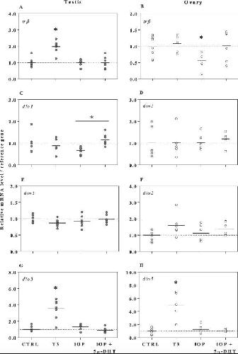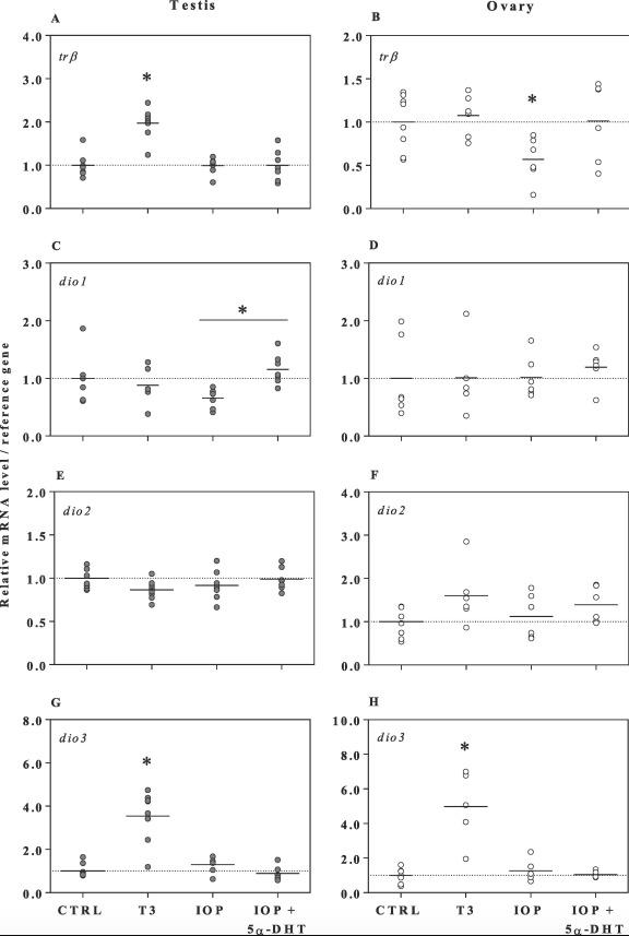 Fig. 3. Expression of trs (trβ) and dios (dio1, dio2, and dio3) in testes (A, C, E, and G, respectively) and ovaries (B, D, F, and H, respectively) exposed ex vivo to triiodothyronine (T3; 50â¯nM), iopanoic acid (IOP; 10â¯Î¼M), and to a co-treatment of IOP (10â¯Î¼M)â¯+â¯5α-dihydrotestosterone (5α-DHT; 1â¯Î¼M) for 6â¯h. Symbols represent individual samples (nâ¯=â¯5â8 per treatment). Testis and ovary gene expression data are normalized to odc and rpl8, respectively and presented as fold changes relative to the control treatment. Significant differences between treatments and the control (*) were identified by one-way ANOVAs followed by post hoc Dunnettâs tests (pâ¯<â¯0.05). Significant differences between treatments were identified by two-tailed t tests (pâ¯<â¯0.05). Note that the scales of the y-axis vary. |