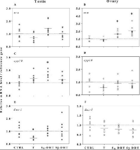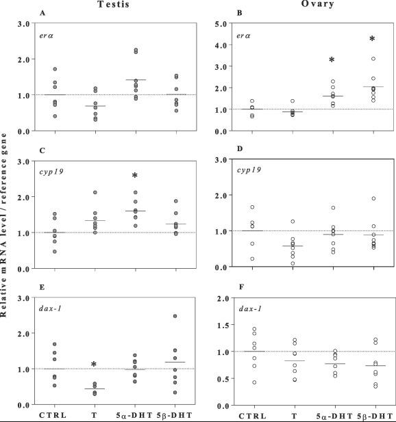 Fig. 4. Expression of erα, cyp19, and dax-1 in testes (A, C, and E respectively) and ovaries (B, D, and F respectively) exposed ex vivo to testosterone (T; 1â¯Î¼M), 5α-dihydrotestosterone (5α-DHT; 1â¯Î¼M), and to 5β-dihydrotestosterone (5β-DHT; 1â¯Î¼M) for 6â¯h. Symbols represent individual samples (nâ¯=â¯6â8 per treatment). Gene expression data are normalized to odc and presented as fold changes relative to the control treatment. Significant differences between treatments and the control (*) were identified by one-way ANOVAs followed by post hoc Dunnettâs tests (pâ¯<â¯0.05). Note that the scales of the y-axis vary. |