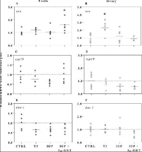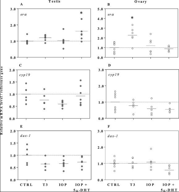 Fig. 5. Expression of erα, cyp19, and dax-1 in testes (A, C, and E, respectively) and ovaries (B, D, and F, respectively) exposed ex vivo to triiodothyronine (T3; 50â¯nM), iopanoic acid (IOP; 10â¯Î¼M), and to a co-treatment of IOP (10â¯Î¼M) + 5α-dihydrotestosterone (5α-DHT; 1â¯Î¼M) for 6â¯h. Symbols represent individual samples (nâ¯=â¯5â8 per treatment). Testis and ovary gene expression data are normalized to odc and rpl8, respectively and presented as fold changes relative to the control treatment. Significant differences between treatments and the control (*) were identified by one-way ANOVAs followed by post hoc Dunnettâs tests (pâ¯<â¯0.05). Note that the scales of the y-axis vary. |
