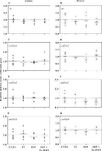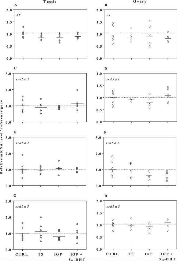 Fig. 6. Expression of ar, srd5α1, srd5α2, and srd5α3 in testes (A, C, E, and G, respectively) and ovaries (B, D, F, and H, respectively) exposed ex vivo to triiodothyronine (T3; 50â¯nM), iopanoic acid (IOP; 10â¯Î¼M), or a co-treatment of IOP (10â¯Î¼M)â¯+â¯5α-dihydrotestosterone (5α-DHT; 1â¯Î¼M) for 6â¯h. Symbols represent individual samples (nâ¯=â¯5â8 per treatment). Testis and ovary gene expression data are normalized to odc and rpl8, respectively and presented as fold changes relative to the control treatment. Significant differences between treatments and the control (*) were identified by one-way ANOVAs followed by post hoc Dunnettâs tests (pâ¯<â¯0.05). Note: scales of the y-axis vary. |