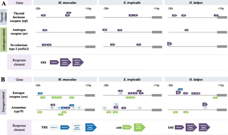 Fig. 1. Promoter analysis of M. musculus, S. tropicalis, and O. latipes TH-related genes (trβ) and androgen-related genes (ar, srd5α2) (A), and estrogen related genes (erα, and cyp19) (B). For information on tr and ar half-site motifs in thyroid- and androgen-re;ated genes please refer to Flood et al. (2013). All sequences used for analysis were collected from the Ensembl Project (http://www.ensembl.org). Putative transcription factor binding sites within the putative promoter (â2000 toâ¯+â¯1) were identified using PROMO (v.3.0.2; Farré et al., 2003) and FIMO (v.4.11.1; Grant et al., 2011) software. TREs are shown in blue, AREs are shown in green, and EREs are represented by purple arrows. This figure was adapted from Fig. 1 in Flood et al. (2013). (For interpretation of the references to colour in this figure legend, the reader is referred to the web version of this article.) |