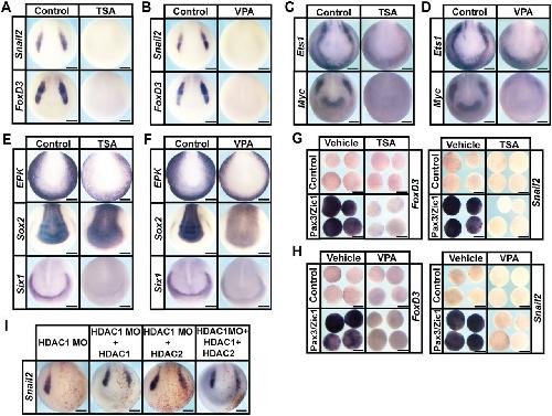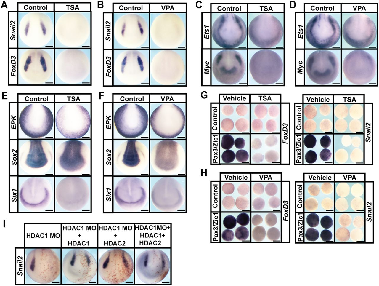 Fig. 1. HDAC activity is required for neural crest formation. (A-D) In situ hybridization examining the expression of neural crest factors snail2, foxd3,ets1 and myc following treatment with vehicle or inhibitor [200â nM TSA (A,C) or 20â mM VPA (B,D)]. Embryos were treated at mid-gastrula stages (stage 11) and collected at mid-neurula stages (stage 15). (E,F) In situ hybridization examining expression of epk, sox2 and six1 following treatment with vehicle or inhibitor [200â nM TSA (E) or 20â mM VPA (F)]. (G,H) Explant assay examining snail2 and foxd3 expression in Pax3/Zic1-induced explants treated with vehicle or inhibitor [200â nM TSA (G) or 10â mM VPA (H)]. Explants were cultured alongside sibling embryos grown until late neurula stages (stage 18). (I) In situ hybridization examining the expression of neural crest factor snail2 in embryos after morpholino-mediated knockdown of HDAC1, and rescued with co-injection of HDAC1, HDAC2 or HDAC1+HDAC2 mRNA. Embryos were injected at the eight-cell stage and collected at mid-neurula stages (stage 15). Scale bars: 250 μm. |