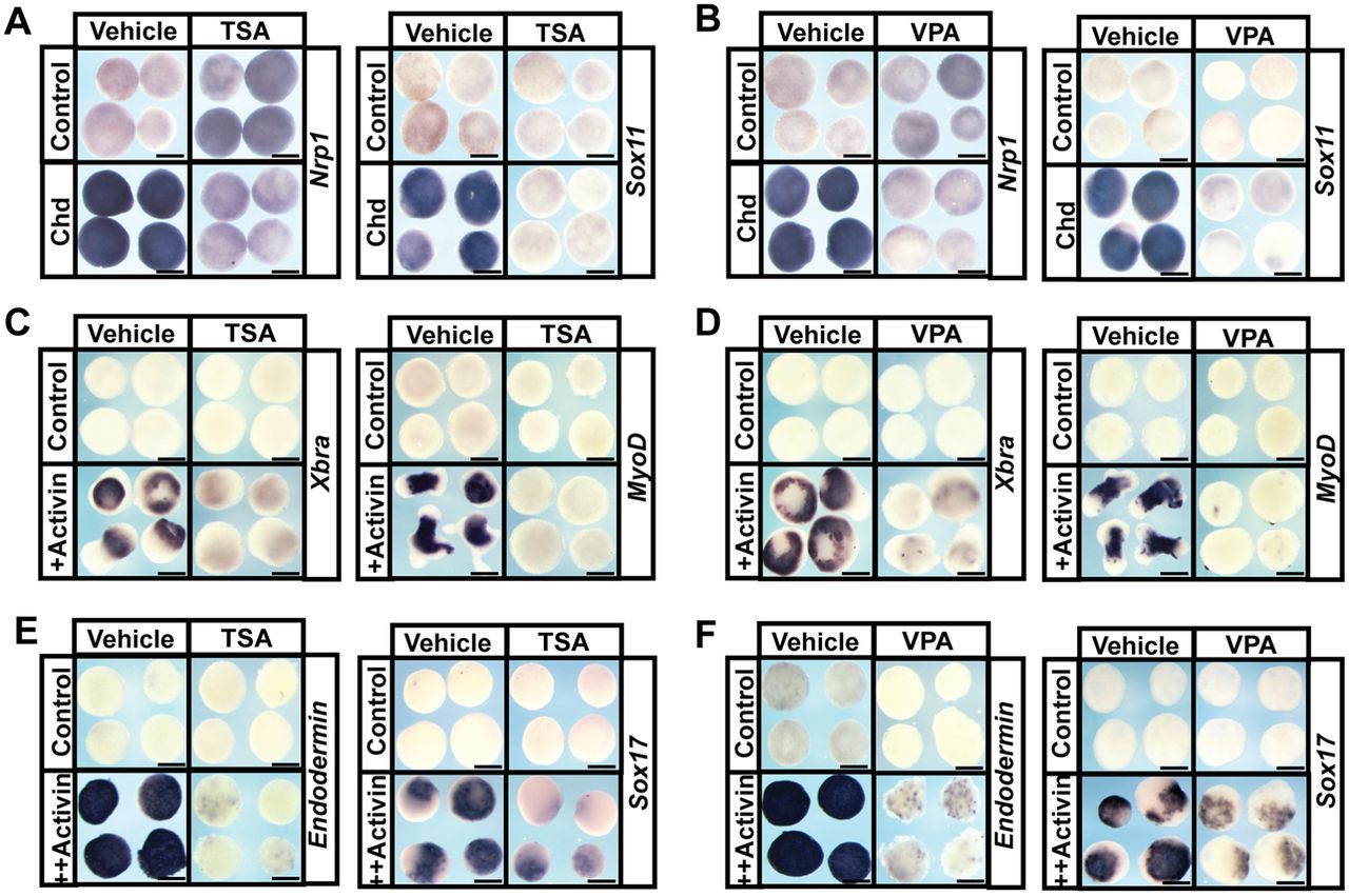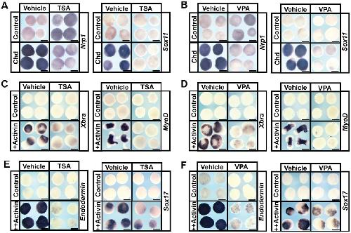 Fig. 3. HDAC activity is required for the pluripotency of blastula stem cells. (A,B) In situ hybridization examining nrp1 and sox11 expression in animal pole explants induced with chordin mRNA and treated with vehicle or inhibitor [500â nM TSA (A) or 10â mM VPA (B)]. Explants were cultured alongside sibling embryos grown until late neurula stages (stage 18). (C-F) In situ hybridization examining expression of mesodermal markers xbra and myod and endodermal markers endodermin and Sox17 in animal pole explants induced with Activin and treated with vehicle (DMSO or water) or inhibitor [500â nM TSA (C,E) or 10â mM VPA (D,F)]. Explants were cultured alongside sibling embryos grown until mid-gastrula stages (stage 11.5) for xbra, endodermin and sox17 expression and late neurula stages (stage 18) for myod expression. Scale bars: 250 μm. |