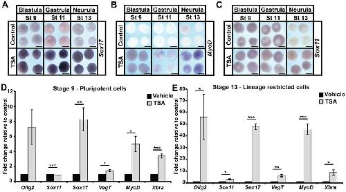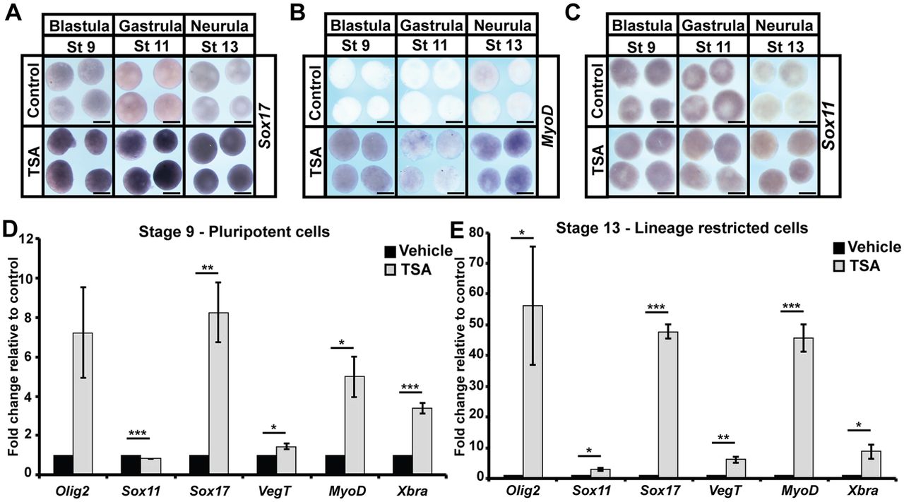 Fig. 4. HDAC inhibition leads to aberrant expression of multiple lineage markers. (A-C) In situ hybridization examining the expression of lineage markers: endoderm (sox17; A), mesoderm (myod; B) and neural (sox11; C) in aging animal pole explants treated with vehicle or inhibitor (500â nM TSA). Explants were cultured alongside sibling embryos and grown until late blastula (stage 9), mid-gastrula (stage 11) and neural plate (stage 13) stages. (D,E) qRT-PCR examining markers of specific lineages [endoderm (sox17, vegt), mesoderm (myod, xbra) and neural (olig2, sox11)] in pluripotent and aged animal pole explants following treatment with vehicle or inhibitor (500â nM TSA) (*P<0.05, **P<0.01, ***P<0.005). Explants were cultured alongside sibling embryos until late blastula (stage 9) and neural plate (stage 13) stages. Scale bars: 250 μm. |