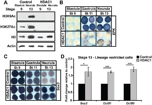 Fig. 6. HDAC1 activity promotes pluripotency gene expression at the expense of lineage restriction. (A) Western blot analysis of lysates of aging animal pole explants from control embryos or embryos injected with HDAC1 mRNA examining H3K9Ac and H3K27Ac alongside total H3 and actin levels. Explants were grown alongside sibling embryos until late blastula (stage 9) and neural plate (stage 13) stages. (B,C) In situ hybridization examining epk and sox3 expression in aging animal pole explants from control embryos or embryos injected with HDAC1 mRNA. Explants were cultured alongside sibling embryos until late blastula (stage 9), mid-gastrula (stage 11) and neural plate (stage 13) stages. (D) qRT-PCR of explants from control embryos or embryos injected with HDAC1 mRNA examining expression of pluripotency genes (*P<0.05, ***P<0.005). Explants were cultured alongside sibling embryos until the neural plate stage (stage 13). Scale bars: 250 μm. |
