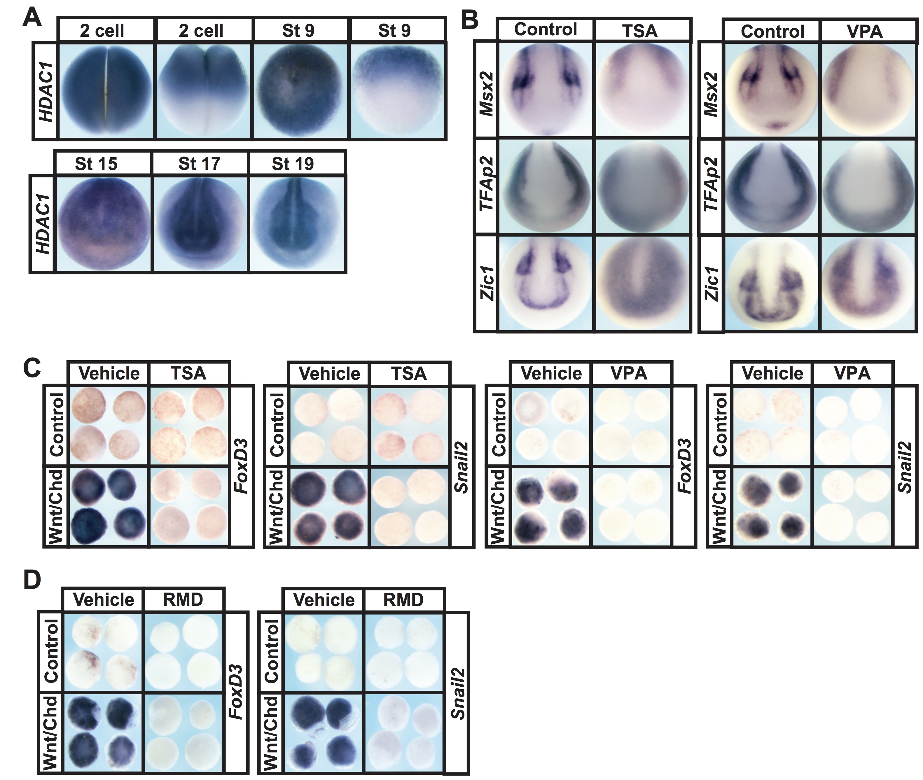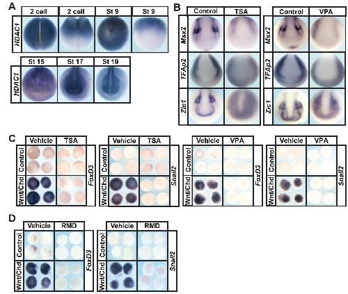 Supplementary Figure 2. (A) In situ hybridization examining HDAC1 expression in early embryos from 2-cell to late neurula stages. (B) In situ hybridization examining neural plate border markers Msx2, Ap2, and Zic1 expression after treatment with vehicle or inhibitor (TSA- 200nM or VPA- 20mM). Embryos were treated at mid-gastrula stages (stage 11) and collected at mid-neurula stages (stage 15). (C) Explant assay examining Snail2 and FoxD3 expression in Wnt/Chordin induced explants that were treated with vehicle or inhibitor (TSA-200nM or VPA-10mM). Explants were cultured alongside sibling embryos grown until late neurula stages (stage 18). (D) Explant assay examining Snail2 and FoxD3 expression in Wnt/Chordin induced explants that were treated with vehicle (DMSO) or inhibitor (RMD â 15uM). Explants were cultured alongside sibling embryos cultured until late neurula stages (stage 18). |