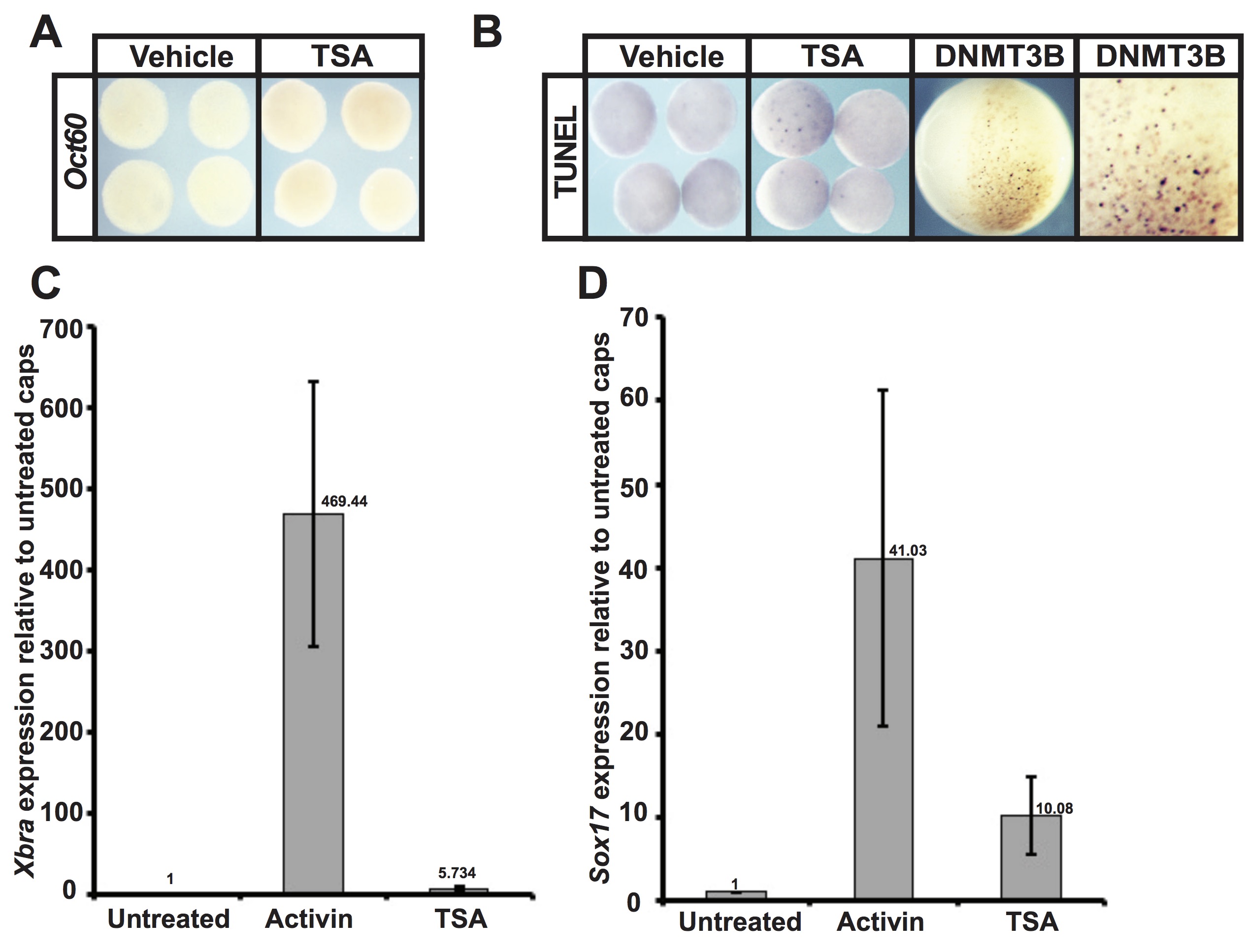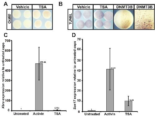 Supplementary Figure 3. (A) In situ hybridization examining Oct60 expression in animal cap explants treated with vehicle (DMSO) or inhibitor (TSA-500nM). Explants were cultured alongside sibling embryos until neural plate stages (stage 13). (B) TUNEL assay examining cell death in the vehicle and TSA treated animal cap explants alongside positive control DNMT3B injected embryos. Explants were cultured alongside sibling embryos until neural plate stages (stage 13). (C),(D) qRT-PCR examining Xbra(C) and Sox17(D) in animal pole explants after vehicle or inhibitor (TSA-500nM) or Activin induction. Explants were cultured alongside sibling embryos until mid-gastrula stages (stage 11.5). |