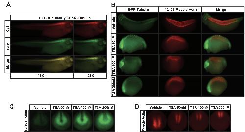 Supplementary Figure 4. (A) Immunofluorescence staining on Tubb2-GFP transgenic embryos costaining GFP with N-Tubulin E7 antibody. (B) Immunofluorescence staining on Tubb2-GFP transgenic embryos co-staining GFP with muscle actin 12101 antibody after treatment with vehicle or increasing amounts of TSA (50nM-200nM). Embryos were treated at mid-gastrula stages (stage 11). (C) Tubb2-GFP transgenic embryos following treatment with vehicle or TSA (50nM â 200nM). Embryos were treated at mid-gastrula stages (stage 11). (D) Immunofluorescence examining 12101- muscle actin staining on embryos after treatment with vehicle or TSA (50nM â 200nM). Embryos were treated at mid-gastrula stages (stage 11). |