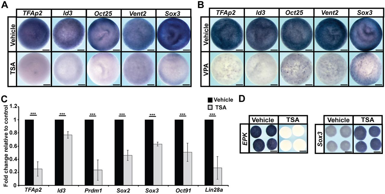 Fig. 2. HDAC activity is essential for proper gene expression in pluripotent blastula cells. (A,B) In situ hybridization examining tfap2, id3, oct25, vent2 and sox3 expression in pluripotent blastula cells following treatment with vehicle or inhibitor [500â nM TSA (A) or 20â mM VPA (B)]. Embryos were treated at the two-cell stage and collected at the late blastula stage (stage 9). (C) qRT-PCR of animal pole explants examining the expression of pluripotency genes after treatment with vehicle or inhibitor (500â nM TSA) (***P<0.005). Explants were cultured alongside sibling embryos grown until late blastula stages (stage 9). (D) In situ hybridization examining epk and sox3 expression in animal pole explants treated with vehicle or inhibitor (500â nM TSA). Explants were cultured alongside sibling embryos until late gastrula stages (stage 13). Scale bars: 250 μm. |