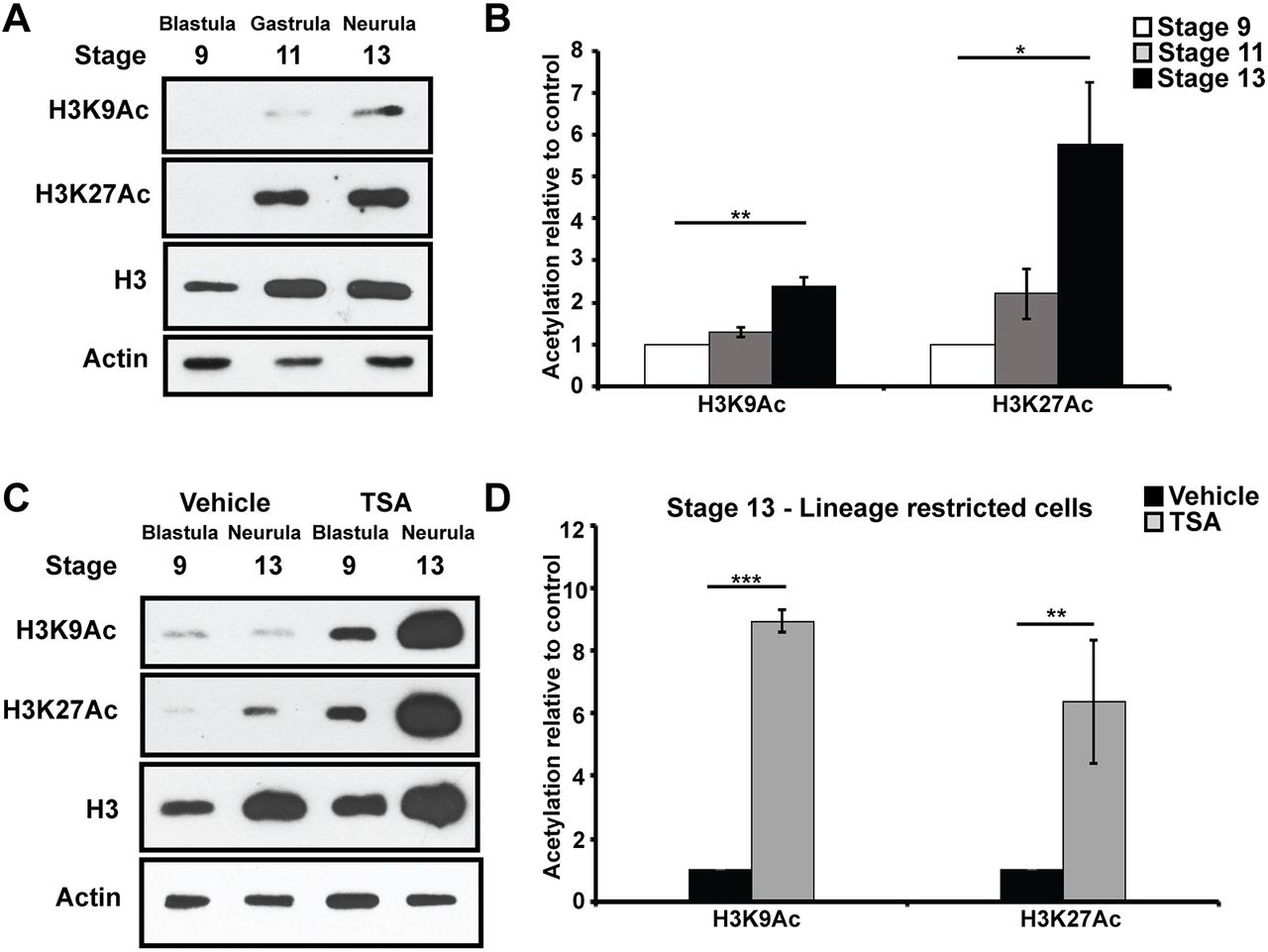 Fig.5. Histone acetylation increases as cells become lineage restricted. (A,B) Western blot analysis of lysates of aging animal caps examining H3K9Ac and H3K27Ac alongside total H3 levels via chemiluminescence (A) and quantified using Odyssey (B) (*P<0.05, **P<0.01). Explants were cultured alongside sibling embryos until late blastula (stage 9), mid-gastrula (stage 11) and neural plate (stage 13) stages. (C,D) Western blot analysis of lysates of aging animal caps treated with vehicle (DMSO) or inhibitor (500â nM TSA) examining H3K9Ac and H3K27Ac alongside total H3 and actin levels via chemiluminescence (C) and quantified using Odyssey (D) (**P<0.01, ***P<0.005). |
