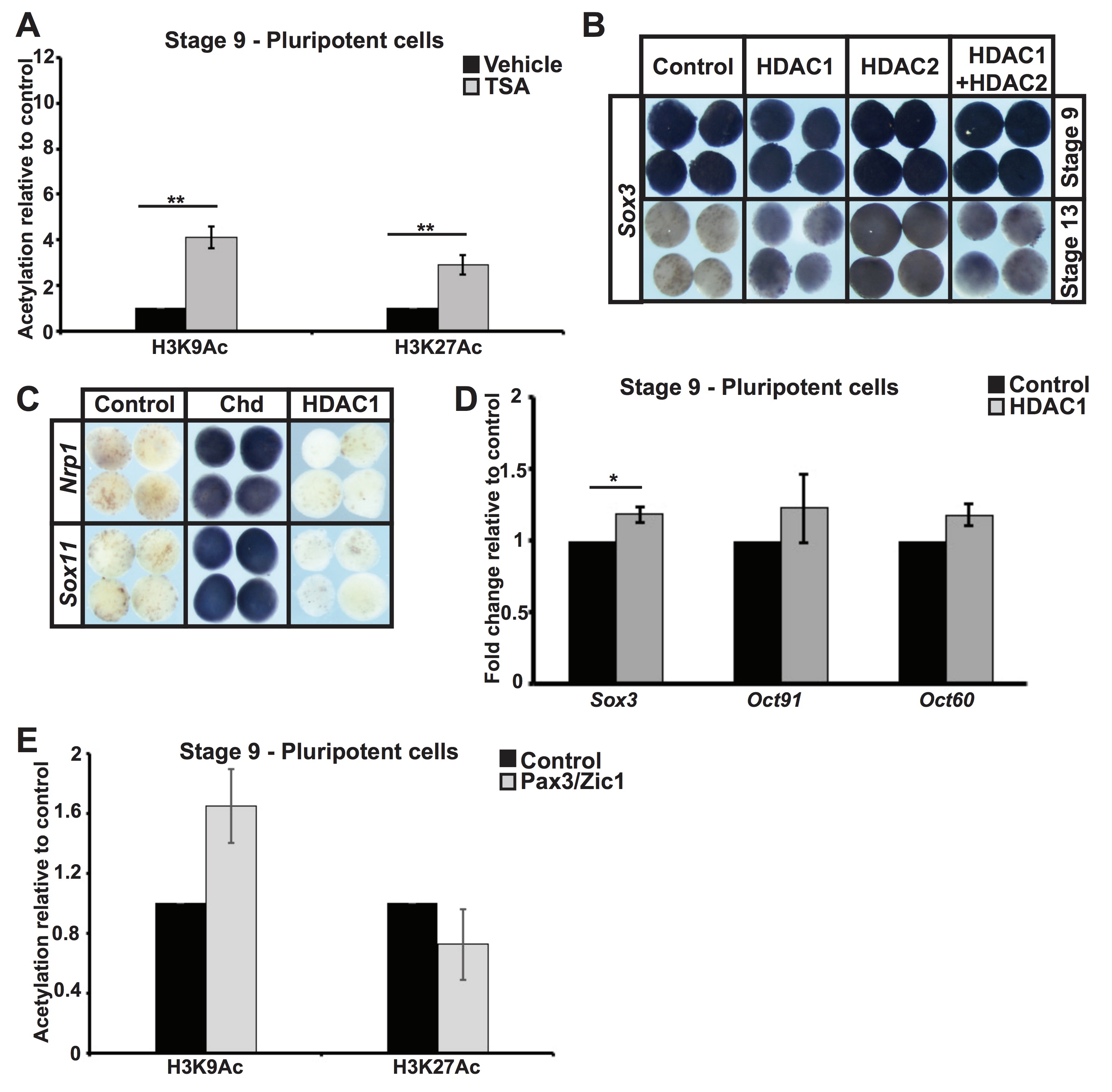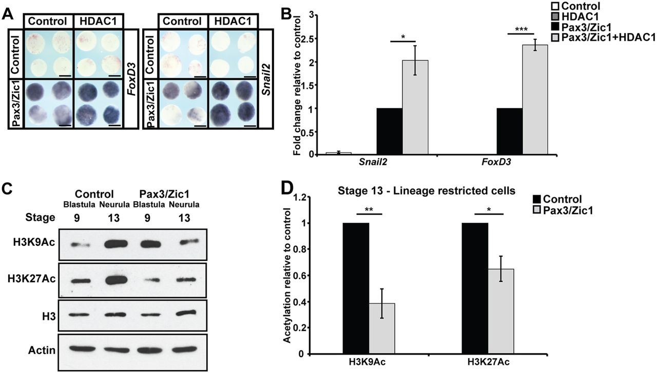 Fig. 7. HDAC activity promotes neural crest formation. (A,B) In situ hybridization (A) and qRT-PCR (B) examining snail2 and foxd3 expression in animal cap explants induced with levels of Pax3/Zic1 titrated for weak neural crest establishment, with/without co-expression of HDAC1 (*P<0.05, ***P<0.005). Explants were cultured with sibling embryos until late neurula stages (stage 18). (C,D) Western blot analysis of lysates of control explants and explants induced with Pax3/Zic1 examining H3K9Ac and H3K27Ac alongside total H3 levels via chemiluminescence (C) and quantified using Odyssey (D) (*P<0.05, **P<0.01). Explants were cultured alongside sibling embryos until late blastula (stage 9) and neural plate (stage 13) stages. Scale bars: 250 μm. |