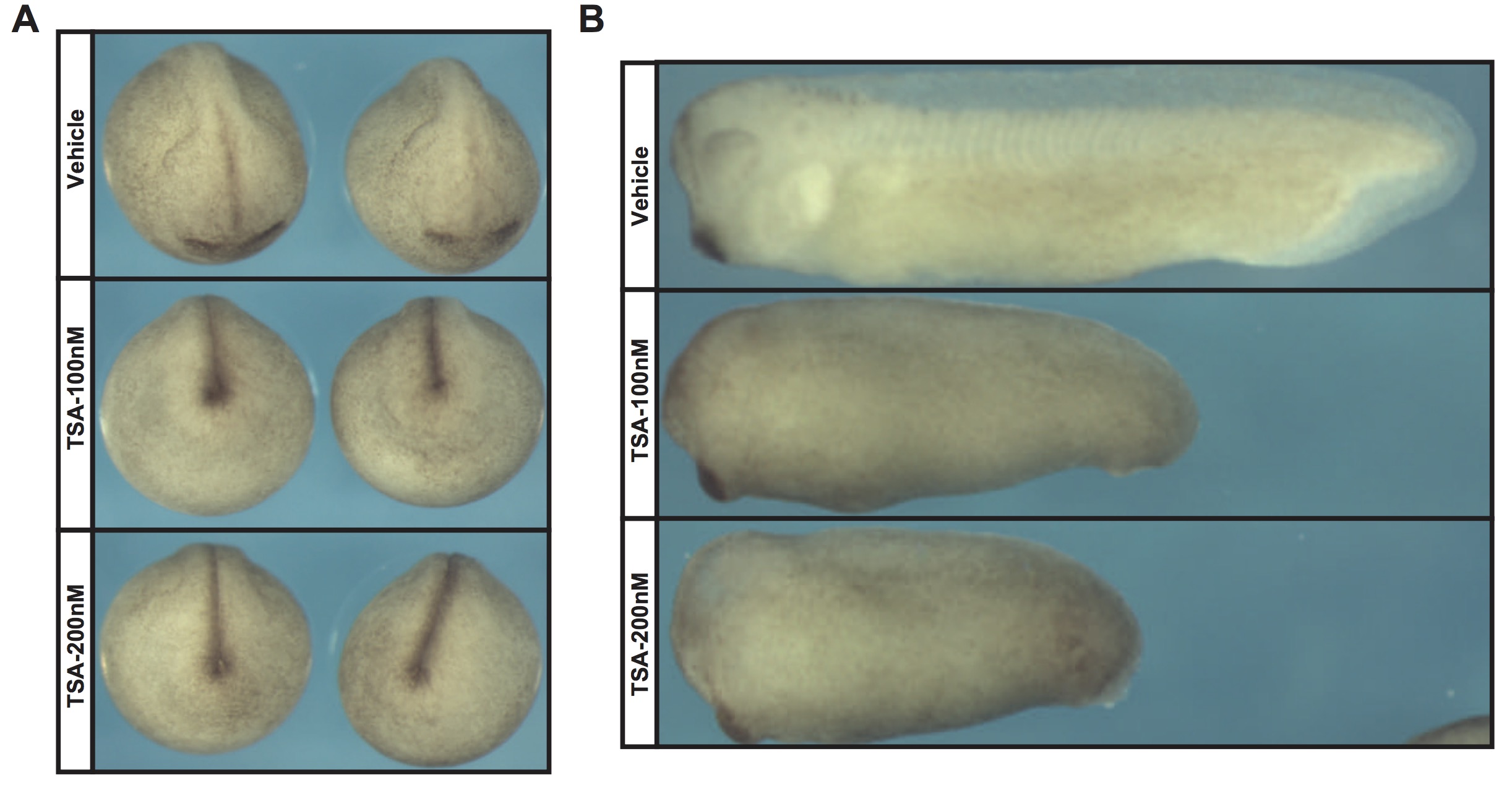 Supplementary Figure 1. (A) (B) Morphological changes in embryos treated with increasing concentrations of TSA (100nM, 200nM). Embryos were treated at mid-gastrula stages (stage 11). |