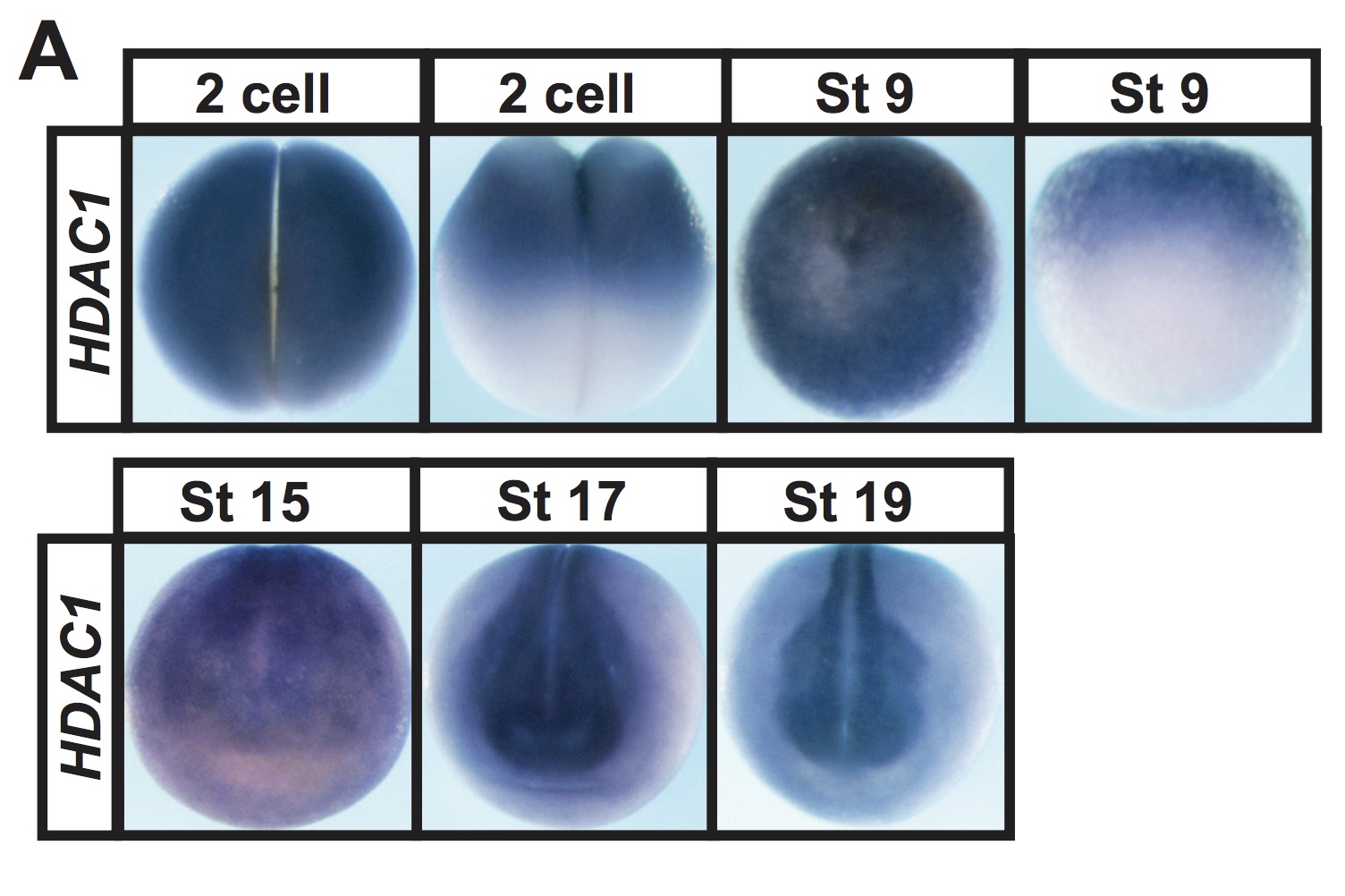 Supplementary Figure 2. (A) In situ hybridization examining HDAC1 expression in early embryos from 2-cell to late neurula stages. |
