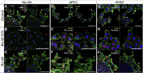 Fig. 1. Ric-8A gain- and loss-of-function affects the localization of polarity markers. Immunofluorescence of CNC explants from embryos treated with a morpholino against Ric-8A (Ric-8AMO) or Ric-8A mRNA. In each case, the proteins of interest are shown in green; the left panels for each condition show the actin cytoskeleton in white and H2B-GFP lineage tracer in green. (AâC) Ric-8A localizes to the protrusions of cells at the leading edge. Subcellular localization of Ric-8A in control cells (A), cells treated with Ric-8AMO (B) and in cells overexpressing Ric-8A (C). (DâF) The localization of the polarity marker, aPKC (PKCξ), changes under the Ric-8A loss-of-function condition. (D) In control CNC explants, aPKC is localized in the anterior region of the leading edge cells, and it is absent at cell-cell contacts. (E) Ric-8A loss-of-function results in loss of aPKC localization in the anterior region of the leading edge cells and the presence of aPKC at cell-cell contacts. (F) Subcellular localization of aPKC in Ric-8A-overexpressing cells. (G) In control cells, PAR3 is localized at the leading edge and at cell-cell contacts. (H) In the Ric-8A morphant condition, PAR3 is lost at cell-cell contacts and its localization at the leading edge is less evident. (I) PAR3 localizes at cell-cell contacts and at the leading edge in Ric-8A-overexpressing cells. Scale bar, 40â¯Î¼m. White arrowheads show normal protein localization, red arrowheads show the absence of specific protein localization in different conditions and green arrowheads show the maintenance of the normal localization. The images are representative of five independent experiments analyzing 8 explants per each condition.