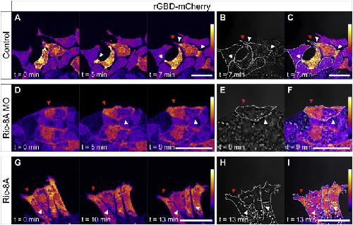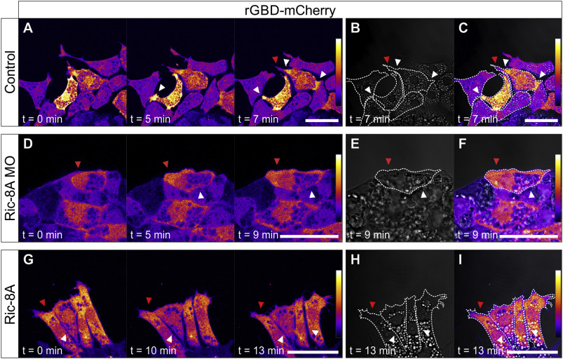Fig. 5. Changes in Ric-8A expression affect the localization of active RhoA. Representative time-lapse images of migrating CNC cells expressing the rGBD-mCherry probe for detection of RhoA activity in Ric-8A loss- or gain-of-function. The images were taken at the indicated time on each panel. (A) Control cells with active RhoA localized at cell-cell contacts at 0, 5 and 7â¯min. The same cells in A at 7â¯min are shown in transmitted light (B) and merged with RhoA activity (C). (D) Cells under Ric-8A loss-of-function show RhoA activity localized in the protrusions at the leading edge at 0, 5 and 9â¯min. The same cells in (D) taken at 9â¯min are shown in transmitted light (E) and merged with RhoA activity (F). (G) Cells under Ric-8A gain-of-function show active RhoA localized in cell protrusions at the leading edge at 0, 10 and 13â¯min. The same cells in (G) at 13â¯min are shown in transmitted light (H) and merged with RhoA activity (I). White and red arrowheads show changes in RhoA activity on the protrusions at the leading edge and cell-cell contacts, respectively. The limits of the cells were marked with stitched lines in the transmitted light panels in order to visualize cell-cell contacts in greater detail. Scale bar, 40â¯Î¼m. Movies from migrating cells can be found in the Supplementary data movie 3. The images and movies are representative of five independent experiments analyzing 3â4 explants per each condition.