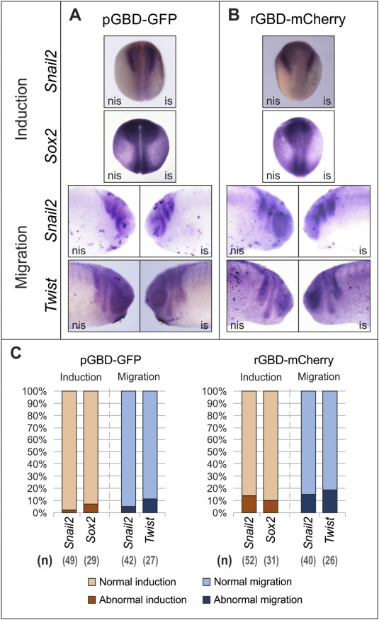 Fig. 2. pGBD-GFP (Rac1 activity probe) and rGBD-mCherry (RhoA activity probe) overexpression does not affect neural crest induction and migration. The effect of microinjection of GTPase-based probes on neural crest (NC) induction and migration was analyzed by whole mount in situ hybridization in Xenopus tropicalis embryos, using snail2 and twist expression as specific NC markers and sox2 as a contiguous marker. Embryos fixed at stage 16 after microinjection of pGBD-GFP (A) and rGBD-mCherry (B) mRNA showed no effect on NC induction, which is visualized at both the injected side (is) and non-injected side (nis). Also, embryos fixed at stage 23â24 showed no defects during cranial NC migration in both the injected side and non-injected side (A and B). (C) Quantification of the observed phenotype as a percentage of the total embryos per condition for each marker used. The embryo images are representative of four independent experiments analyzing 30â50 embryos per condition.