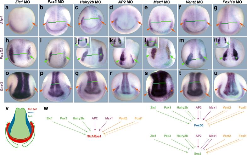Fig. 1 Requirement of early ectodermal TFs for PPE and NC formation. aâu Expression of PPE (Six1, Sox3), NC (FoxD3) and neural plate (Sox3) markers in dorsal views of neural plate stage Xenopus embryos after injection of MOs blocking translation of early ectodermal TF genes. Anterior is to the bottom. Control side is shown on the left and injected side on the right (as indicated by blue LacZ staining). Reductions (arrows) and increased or ectopic expression domains (asterisks) in the neural (green) and non-neural ectoderm (orange) compared with the control side (arrowheads) are indicated. Green lines highlight broadening of the neural plate and lateral displacement of NPB markers on the injected side (bright green) versus control side (dark green). Insets show alternative phenotypes. v Schematized gene expression domains of Six1/Eya1 (PPE: red), FoxD3 (NC: blue) and Sox3 (neural plate and PPE: green outlines) in a neural plate stage Xenopus embryo (dorsal view, anterior to the bottom). Sox3 expression in neural plate is indicated by green filling. Modified from [27]. w Summary of regulatory interactions. Arrows indicate requirement of TFs for expression of Six1/Eya1, FoxD3 or PPE Sox3 (reduction after TF knockdown). Bars indicate requirement of TF for restriction of expression of Six1/Eya1, FoxD3 or Sox3 (increase after TF knockdown). Faint colors indicate less frequent phenotypes. See Additional file 1: Table S3 for numbers. |