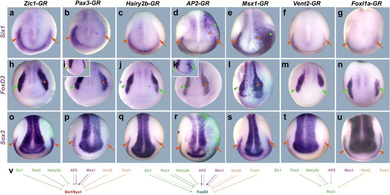 Fig. 2 Role of early ectodermal TFs for PPE and NC formation. aâu Expression of PPE (Six1, Sox3), NC (FoxD3) and neural plate (Sox3) markers in dorsal views of neural plate stage Xenopus embryos after injection of mRNAs for hormone-inducible early ectodermal TF genes and dexamethasone activation from stage 11â12. Anterior is to the bottom. Control side is shown on the left and injected side on the right (as indicated by blue LacZ staining). Reductions (arrows) and increased or ectopic expression domains (asterisks) in the neural (green) and non-neural ectoderm (orange) compared with the control side (arrowheads) are indicated. Insets show alternative phenotypes. v Summary of regulatory interactions. Arrows indicate ability of TFs to promote expression of Six1/Eya1, FoxD3 or Sox3. Bars indicate ability of TF to repress Six1/Eya1, FoxD3 or PPE Sox3. Faint colors indicate less frequent phenotypes. See Additional file 1: Tables S4 and S5 for numbers. |